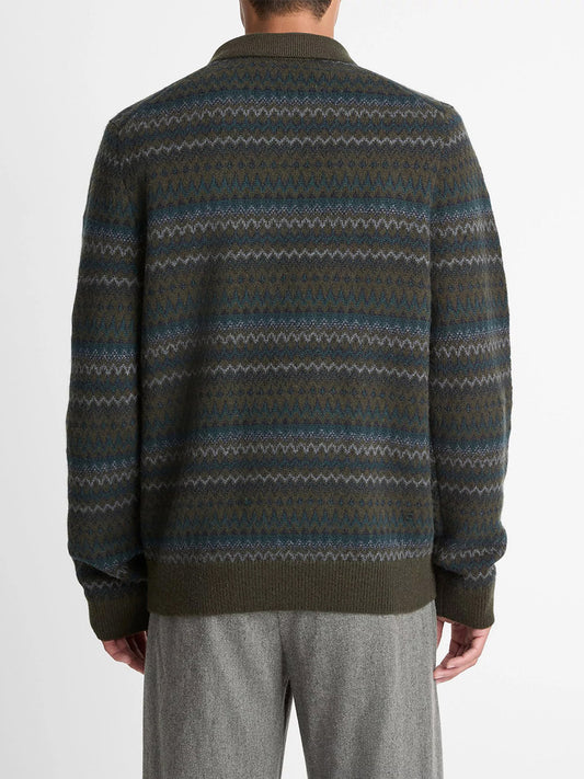 Vince Fair Isle Wool-Cashmere Johnny-Collar Sweater in Dark Leaf Combo