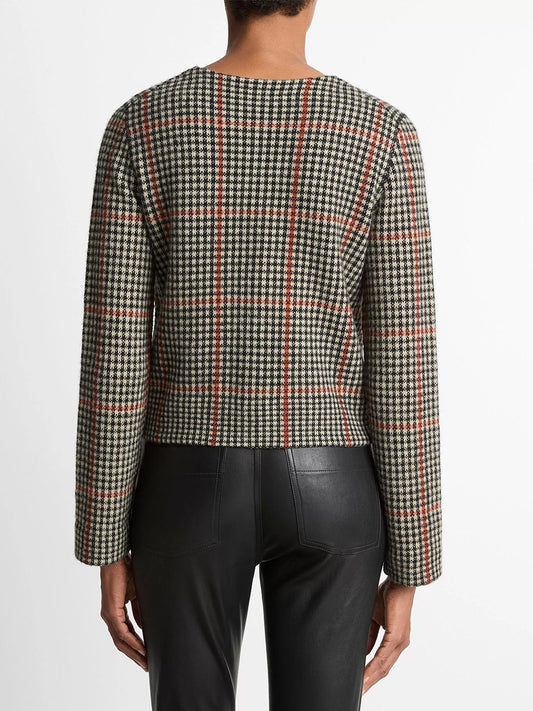 Vince Glen Plaid Wool-Cashmere Cardigan Jacket in Cobblestone/Black Combo