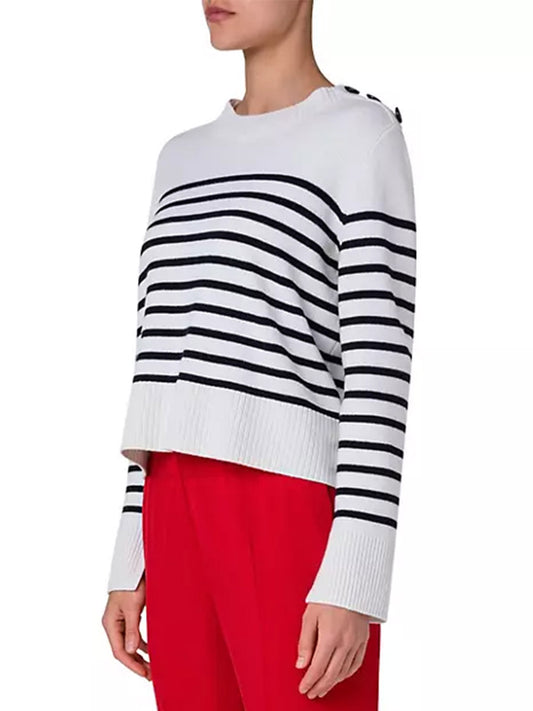 Akris Punto Striped Crew Sweater With Snap Shoulder in Cream/Black