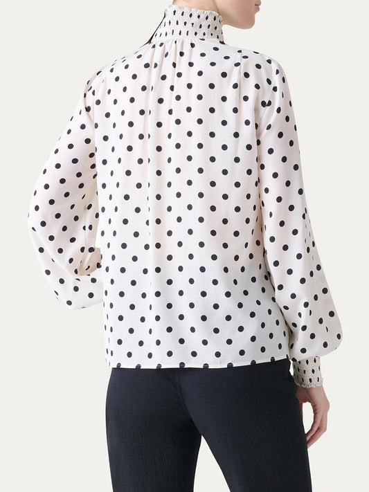 Akris Punto Smocked Polka Dot Silk Blouse in Cream/Black