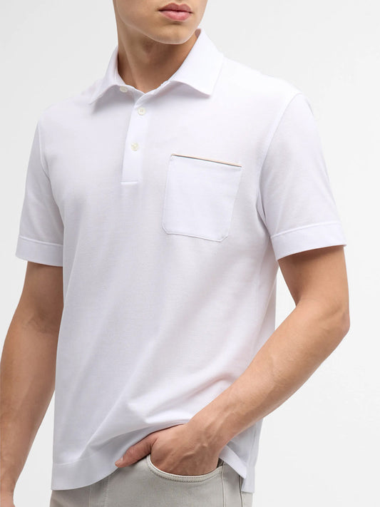 Zegna Polo Pure Cotton Piqué with Leather Trim Pocket in White