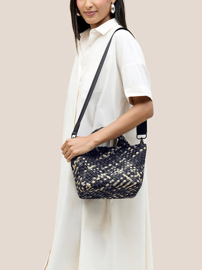 Handwoven neoprene in Ecru and black. Perfect for carrying all day, the St. Barths Small Tote is the bag you'll reach for every morning. Watercolor is delicately hand shaded to create a fluid, layered effect. Open top. Detachable, adjustable crossbody strap. Matching woven zippered pouch included. Dimensions: 7.5"H x 14"W x 6"D. Strap drop: 3.5".